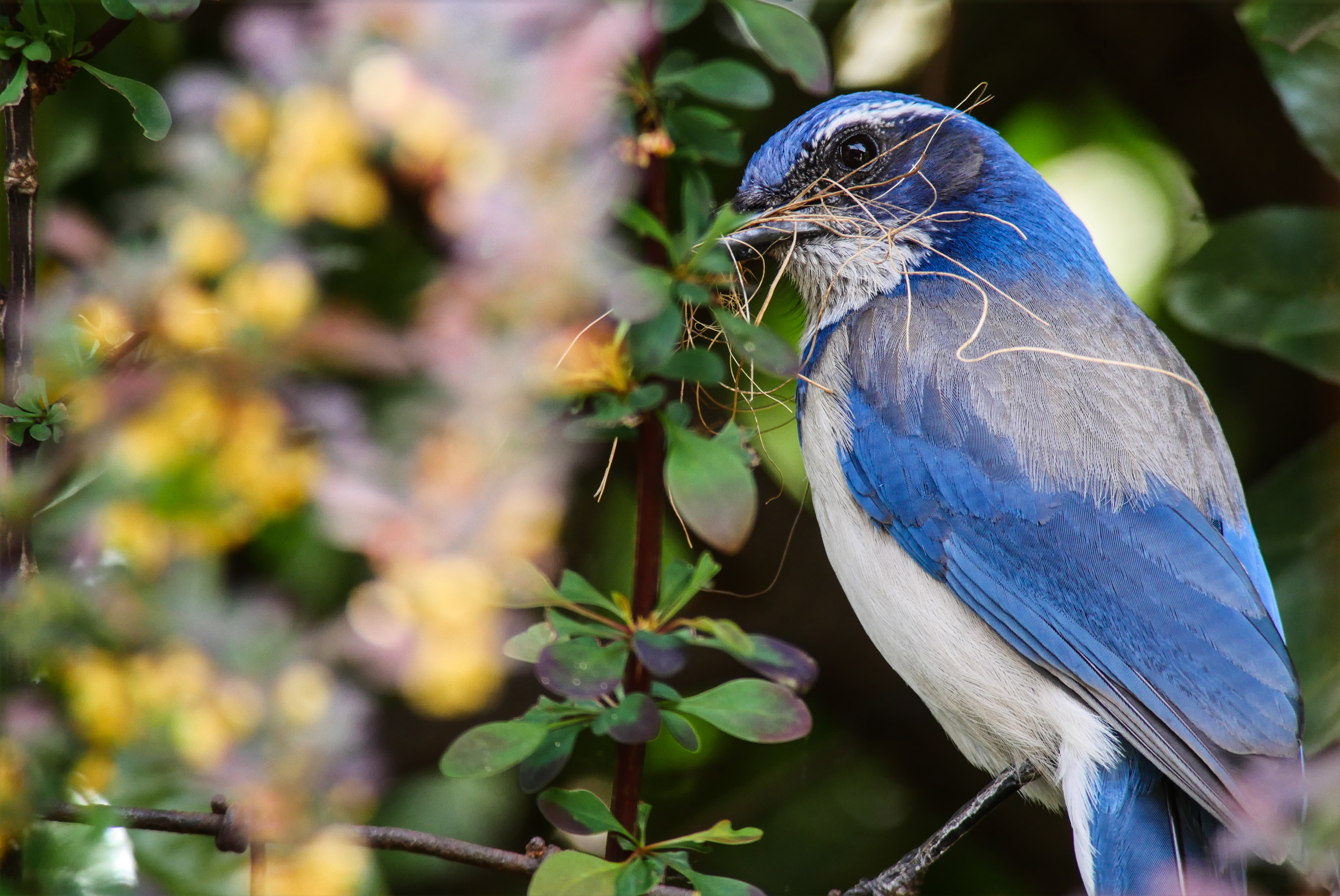 Been watching a Jay couple build a nest, this fellow is waiting as his mate finishes weaving in her bundle.