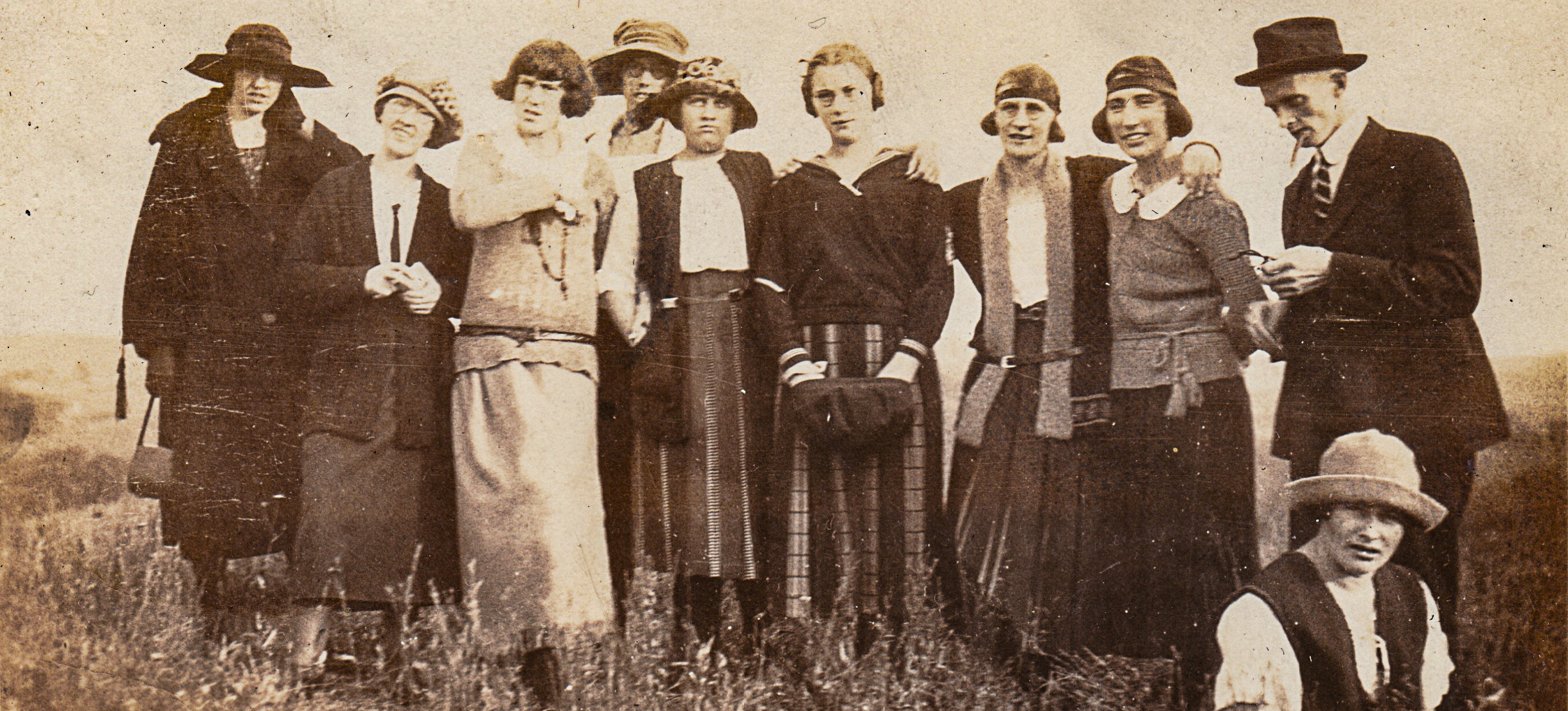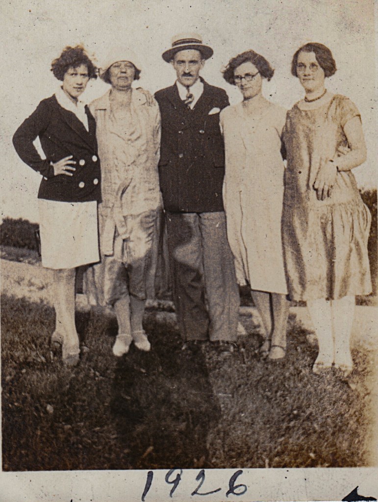 Otto in the center of women, one year before he marries Christine. Christine is holding her hand out with a big ring on her finger.