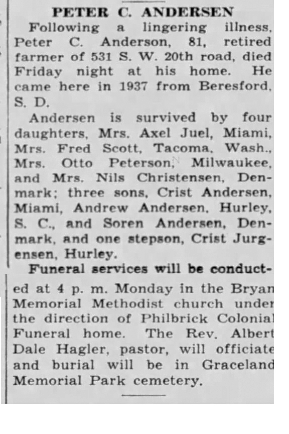 Peder Christian Andersen, died in Miami Florida on an unspecified day in April 1943